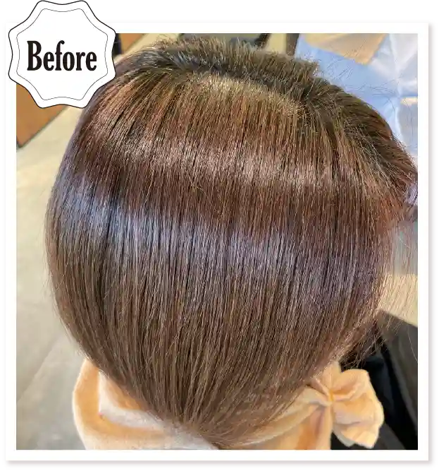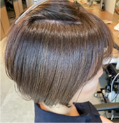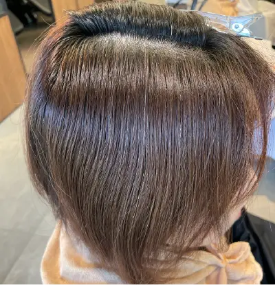 白髪の量はそこまで多くないけど気にしてる方で初めて白髪ぼかしをする場合に、明るすぎる仕上がりを心配されるケースがあります。ハイライトの筋感を強調するわけではなく、白髪への馴染みを優先した薬剤選択です