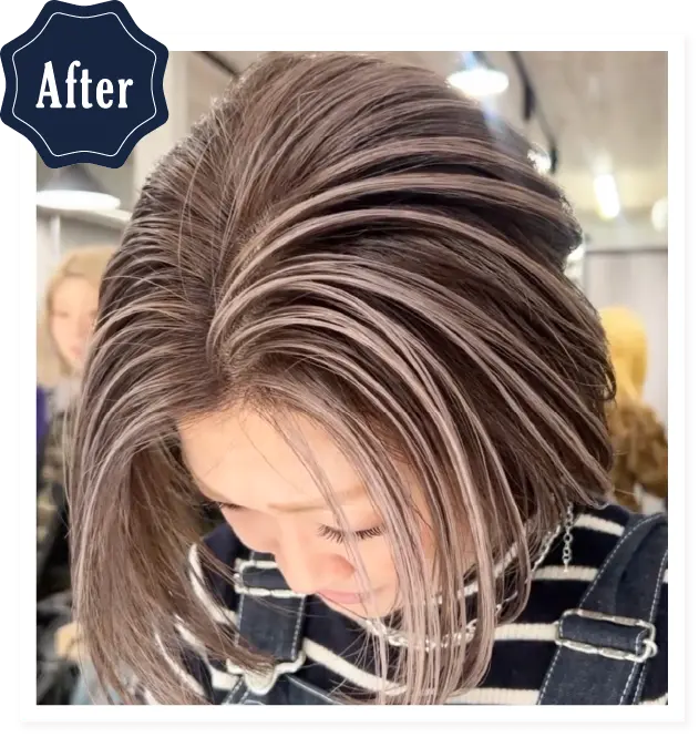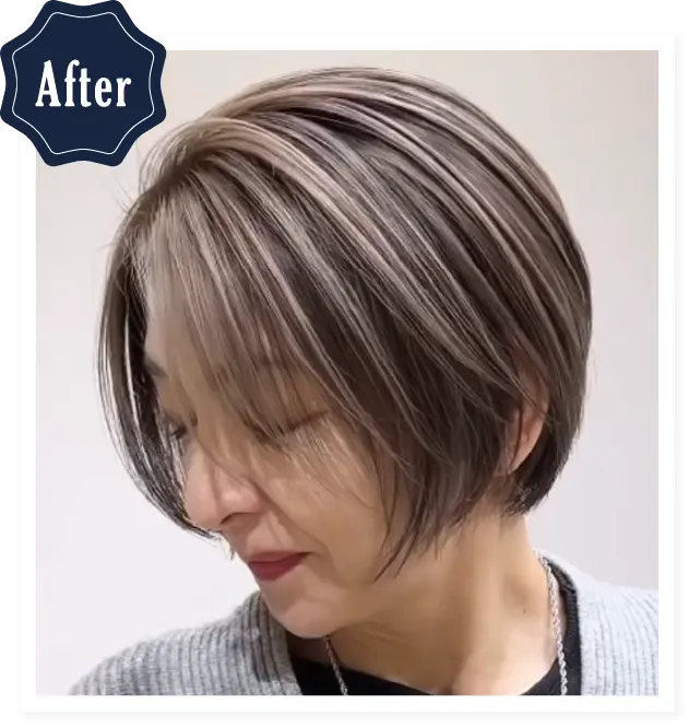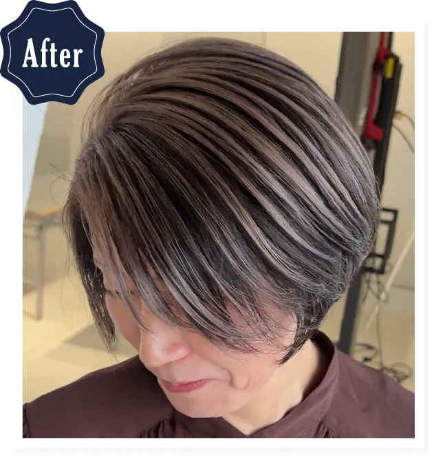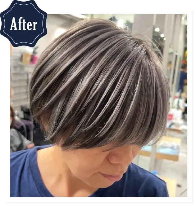 脱白髪染め・白髪ぼかしハイライト・バレイヤージュなど、白髪をデザインとするのが得意です。