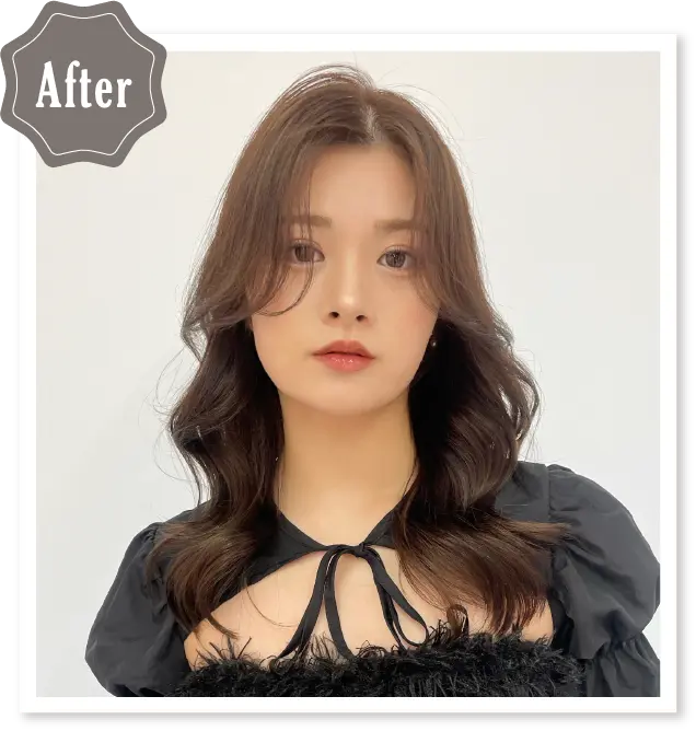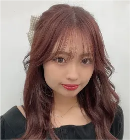 顔まわりにたっぷりレイヤーカットを入れることでワンカールでもスタイリングが決まります。あえて眉下ぱっつんバングにすることで大人すぎず、抜け感を出しています。