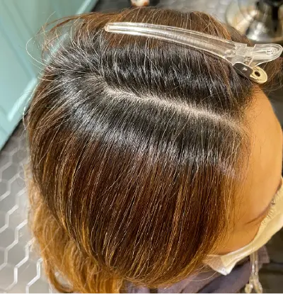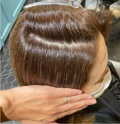 その後、全体にトナーすることで根元から少しグラデーションになるように時間差で塗布してます。