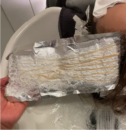 ブロンダープレックス Hで3㎜チップのハイライトを塗布後に間塗りをして全体染めています。