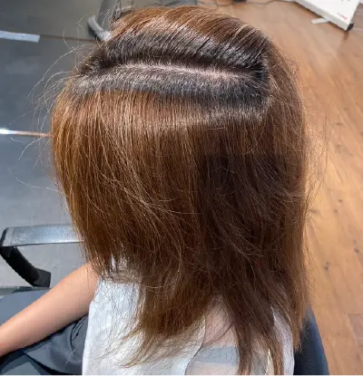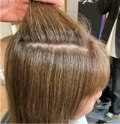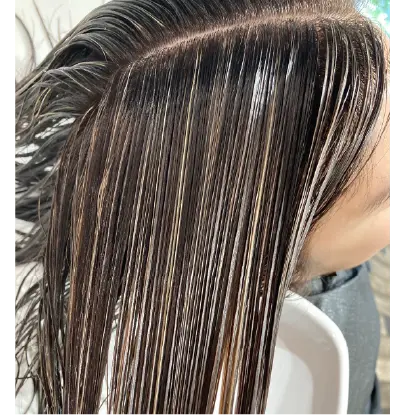 高明度をアレンジする加減法で黒髪は9レベル,白髪は13レベル,ハイライトは15レベルのコントラストに仕上がるようにレシピをアレンジしています