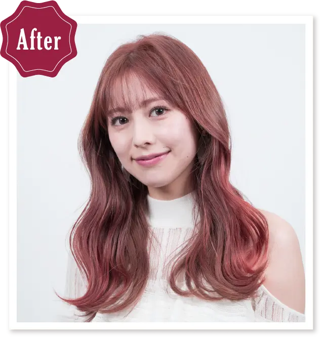 ヴィンテージ感のあるピンクは、アジア人の肌に合わせやすい春らしいカラー。マゼンタにプラチナレジェンドをアレンジすることで、彩度をやや落ち着かせて今っぽく仕上げました。毛先にはほんのり上気したようなピンクを覗かせて。逆毛を立ててからカラーリングし、自然な立体感をつくっています。