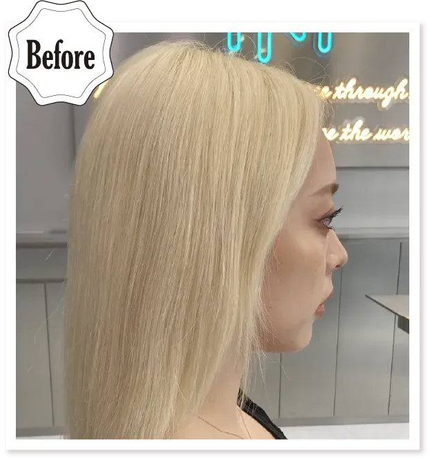 肌なじみの良さやブリーチ特有のぎらつきを抑え、ハイトーンながらも上品でやわらかな雰囲気に。明るいベースのため、クリアで濃さを調整しました。