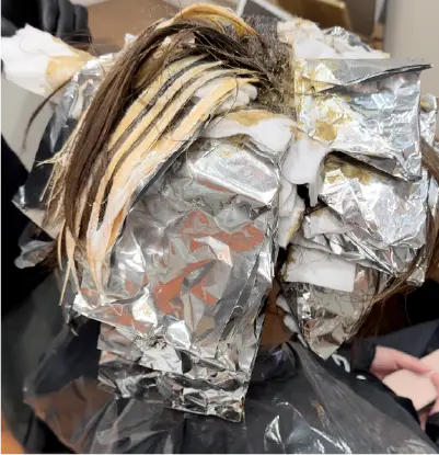 ハイライトは、ブロンダープレックス Hで顔まわりは3%、その後4.5%、最後に入れるフォイルは6%で入れています