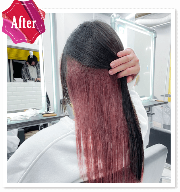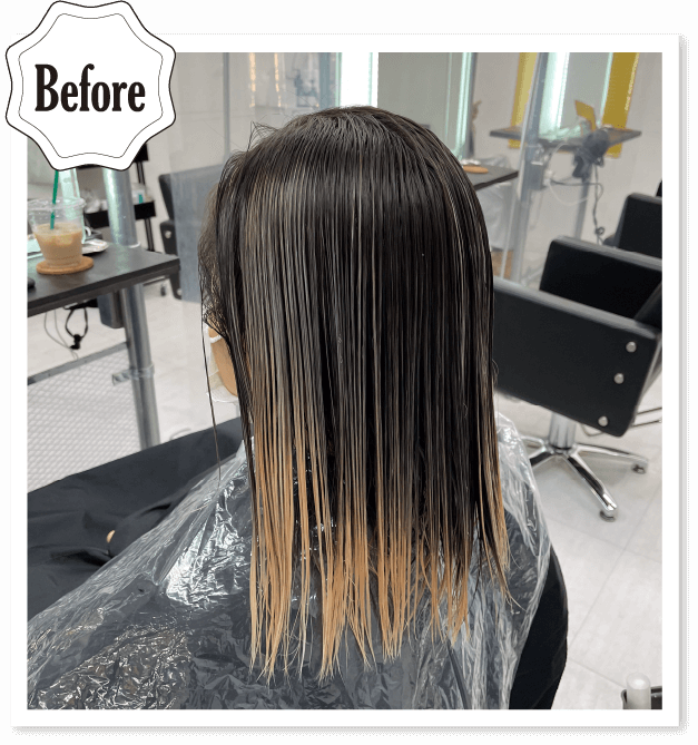 バレイヤージュのブリーチベースに16を使うと中間の繋ぎめの赤みを抑えながら誰でも簡単にパールホワイトを作れます。