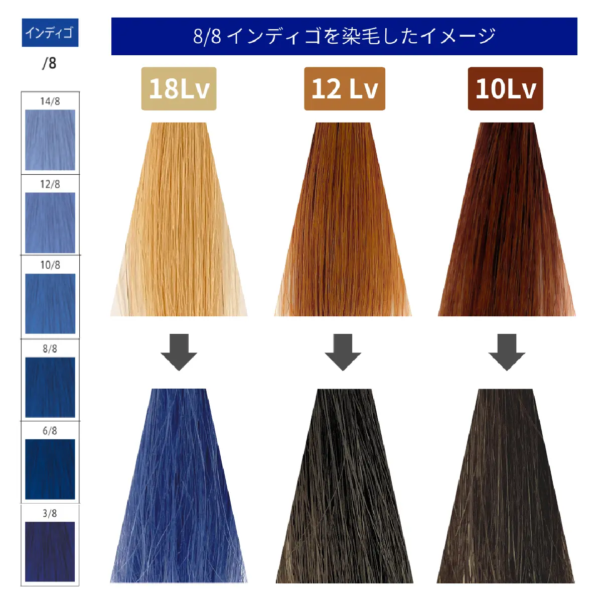 ピュアでクリアなブルーが硬い髪の赤みやオレンジみを抑え、透明感の高いブルーアッシュに。赤みを抑える補色としても活用できます。3/8は暗髪ブルージュにもオススメです。