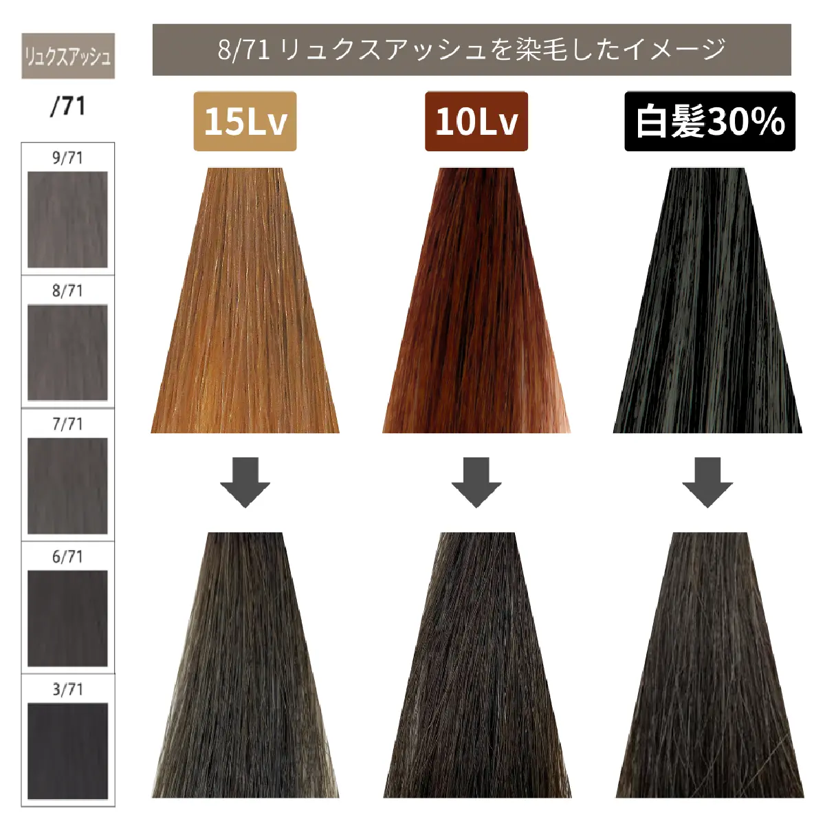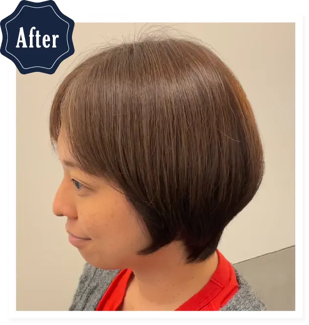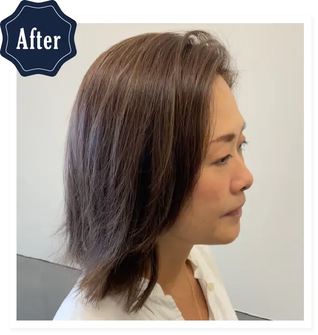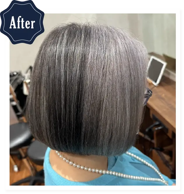 わざとらしさのない自然な色調で白髪をカモフラージュしてくれるクールブラウン。寒色の雰囲気がありながらもあたたかみを感じる上品な印象に。脱白髪染めのファーストステップとしてもオススメです。