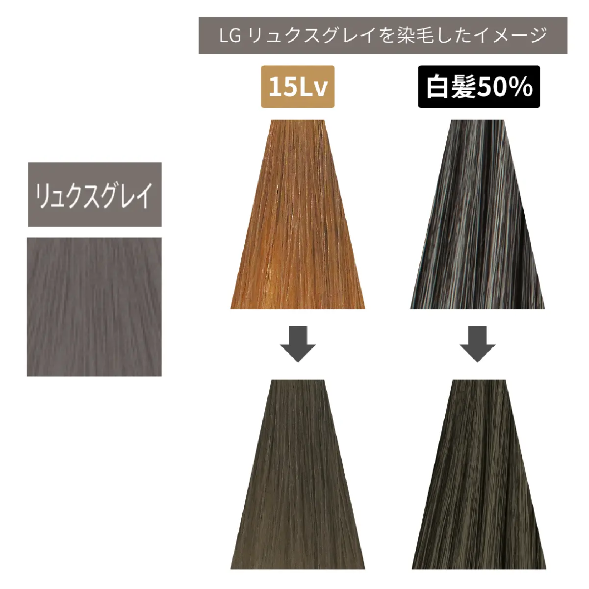 赤みのないグレージュ。 白髪やブリーチ毛の黄みを抑え、年齢肌を明るく見せる。明度を上げず、最低限のアルカリで調整されているので白髪素材を生かすオンカラーに最適です。