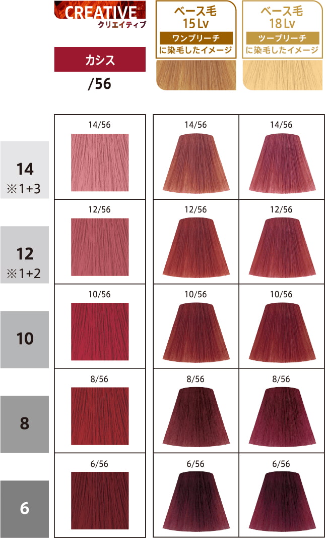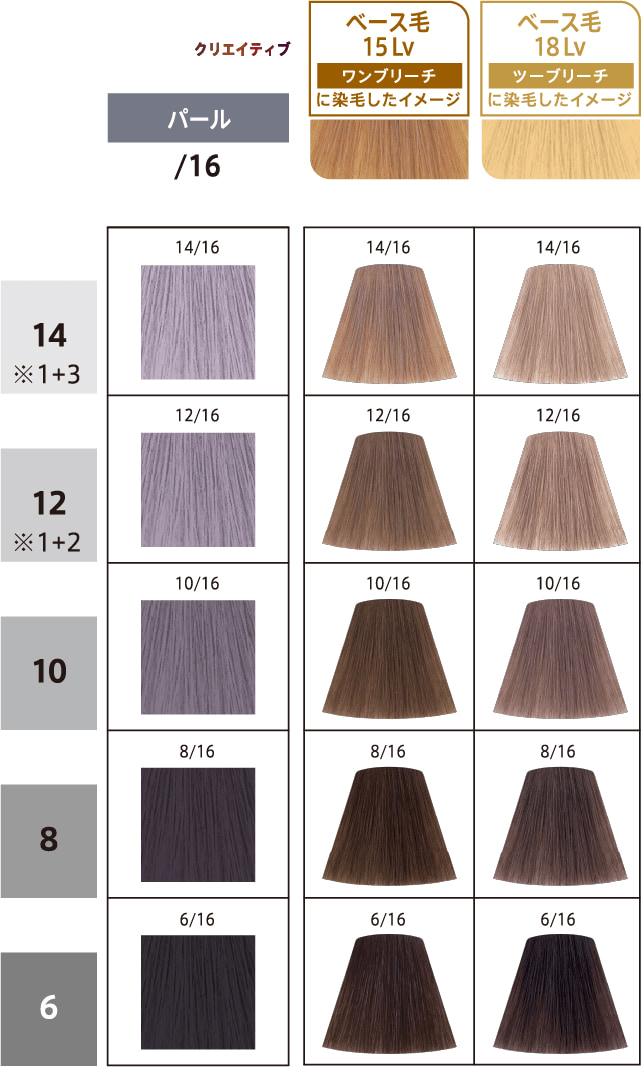 「/16パール」と「/56 カシス」は、ブリーチオンカラーで簡単に表現できるようにアンダートーンのコントロール「補色」や褪色傾向をコントロールする「深み」までを考慮して開発されました。 1本で誰にでも似合わせやすい人気の髪色を表現できるだけでなく、褪色過程までも楽しめる新色でご自身のカラーデザインの幅を広げてください。