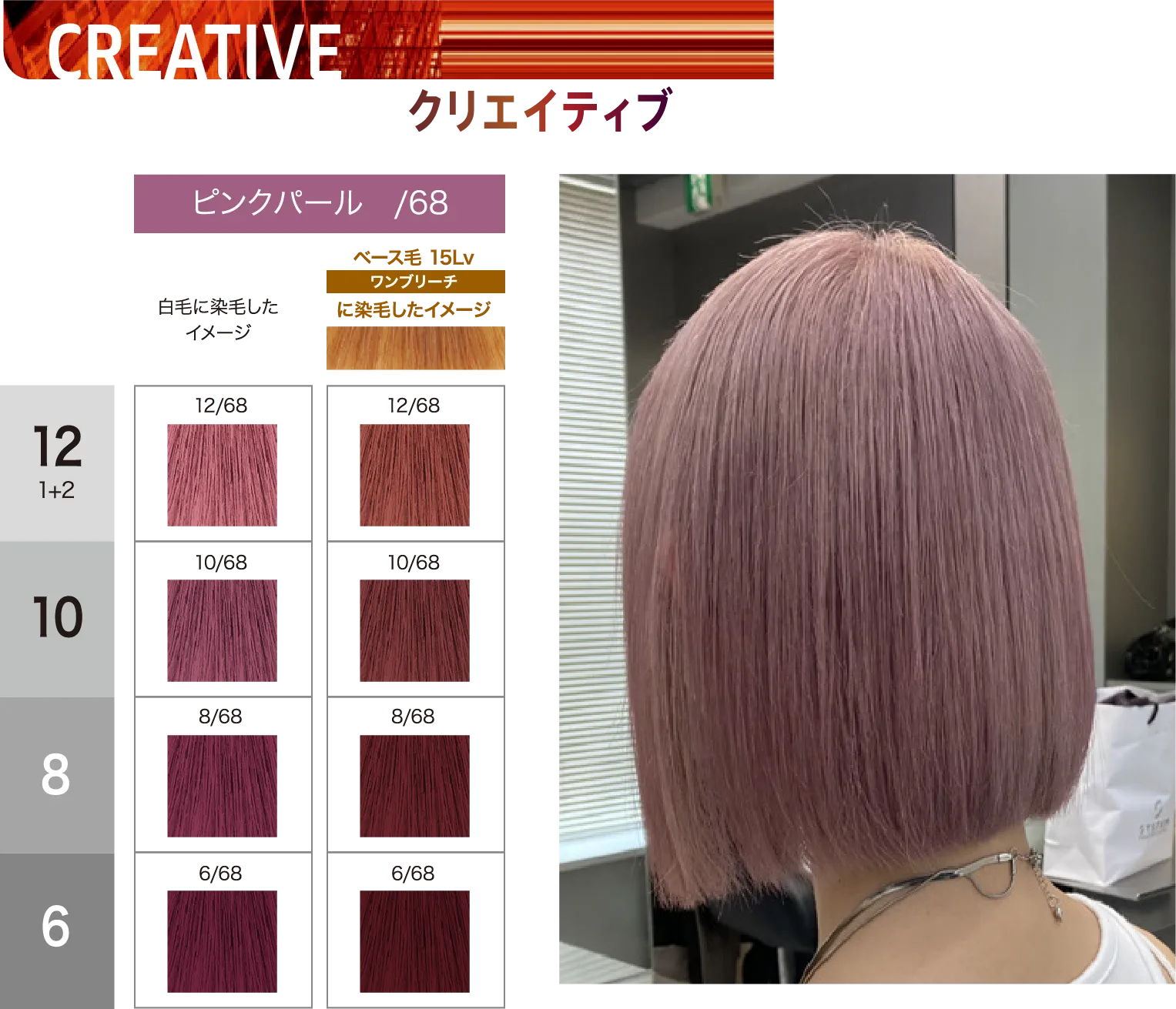 補色を必要とする様々なシェードと相性がよく、不安定なブリーチ毛での発色を安定させるピンクパープルカラー。単品使いではやわらかなピンクパールの仕上がりに。