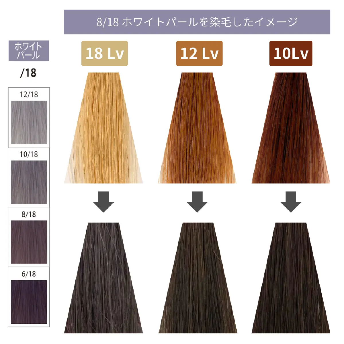 補色のブルーバイオレットが黄みを消しつつ、寒色寄りのシャープな白っぽさを表現します。紫が強すぎないので使いやすく、複雑なカラー履歴を持つさまざまなベース毛に対応します。