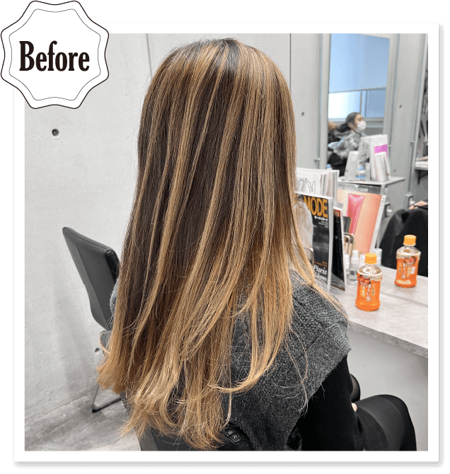 バレイヤージュ履歴にホワイトパール+AC2%でワンタッチ抜けきらないアンダートーンに多少のオレンジがあってもしっかり打ち消してくれます。バレイヤージュのコントラストをなくさずに、狙い通りのホワイトパールになります。アンダーのオレンジが強めな時はAC2%がオススメです。
