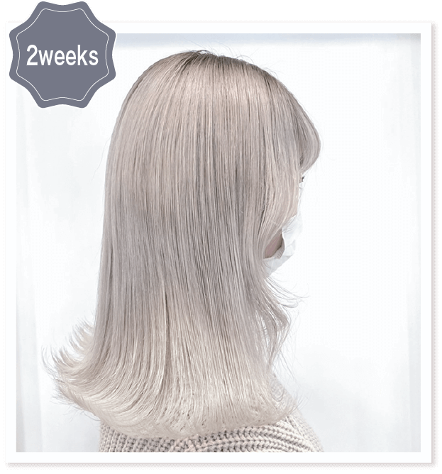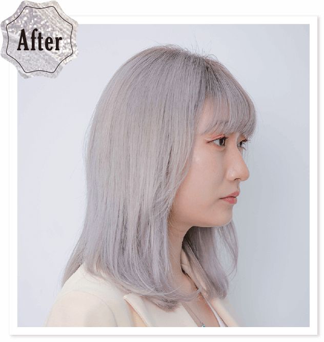 黄色みが残ったブリーチ毛はパサついて見えてしまうが、パールに含まれる紫が黄ばみを抑え、さらりとした質感のカラーに。ダメージ毛なのでしっかり前処理をしてからブリーチし、オンカラーもコーミングは最小限にして手でやさしく揉み込むことで、より美しい仕上がりに。