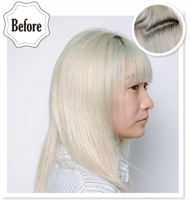 新生部1.5cm。1カ月前にブリーチオンカラーをして中間毛先は複数回のブリーチ履歴があり明度は18 レベル。全体的に黄ばみが感じられる。